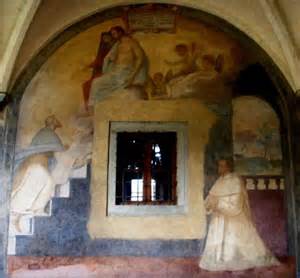 During this period Guala had the revelation of Saint Dominic’s greatness that became the subject of many early legends. Although they were good friends, Guala did not know that Dominic was dying on their return from a chapter. Guala had fallen asleep with his head leaning against the belltower of the conventual church at Brescia when he had a vision of two ladders coming down from heaven. Our Lord was visible at the top of one ladder, and Our Lady at the top of the other. Angels were ascending and descending on them. As Guala watched, a friar, who sat at the foot of one ladder with his face covered was drawn up to heaven and great glory surrounded him. Guala awoke, deeply affected by the vision, and went immediately to Bologna, where he found that Saint Dominic had died at the time of his vision.