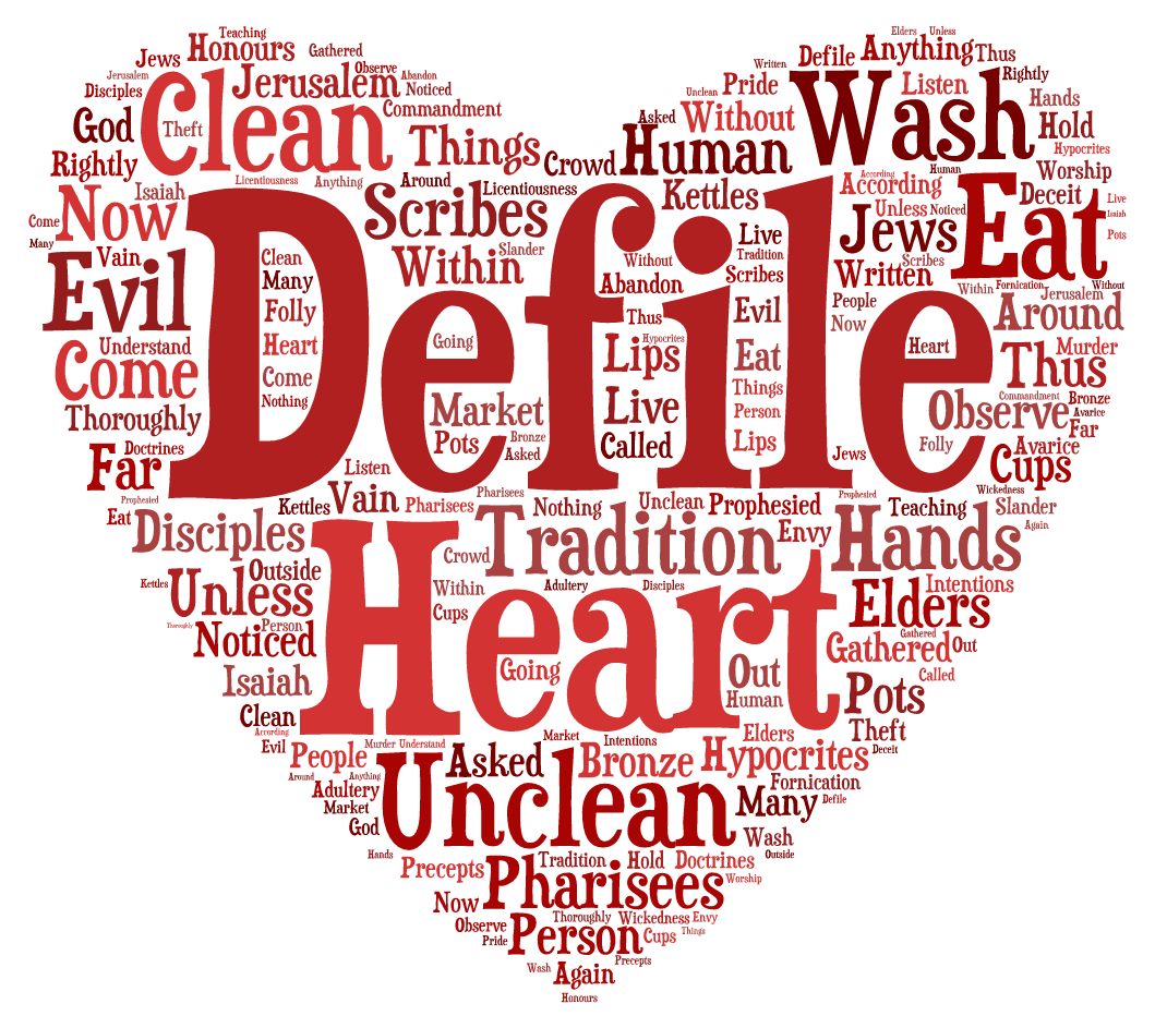 Next, Jesus comments on the meaning behind the Pharisees’ language of holiness—clean and unclean. Jesus teaches that a person is not defiled by the food that enters his or her body, but rather by sin that emerges from his or her words and actions. In this teaching, Jesus unmasks a deeper question behind the one posed to him by the Pharisees. The real issue is holiness, which is not found in external acts alone. Holiness comes from within and is evidenced in the actions and attitudes that emerge from a person’s life.