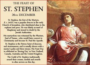 Today, the day after all the joy and celebration of the birth of Our Lord, and after all the traditional enjoyment of the traditional festive food and gift giving, we come in total contrast, to the Feast of St. Stephen the first Martyr.