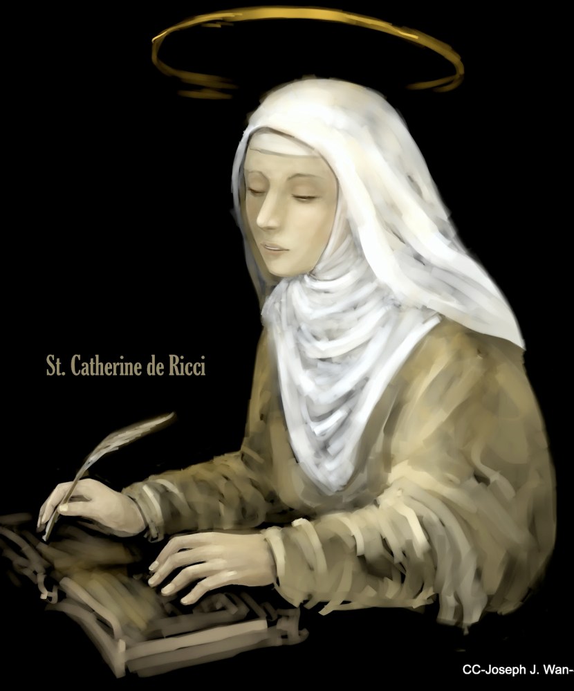 Sister Catherine was 20 when she began a 12-year cycle of weekly ecstasies of the Passion from noon each Thursday until 4:00 p.m. each Friday. The first time, during Lent 1542, she meditated so heart-rendingly on the crucifixion of Jesus that she became seriously ill, until a vision of the Risen Lord talking with Mary Magdalene restored her to health on Holy Saturday.