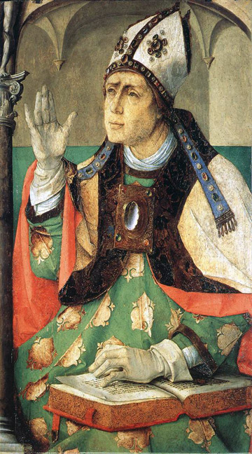 Representation: elevating the Eucharist as he wears a rope around his neck